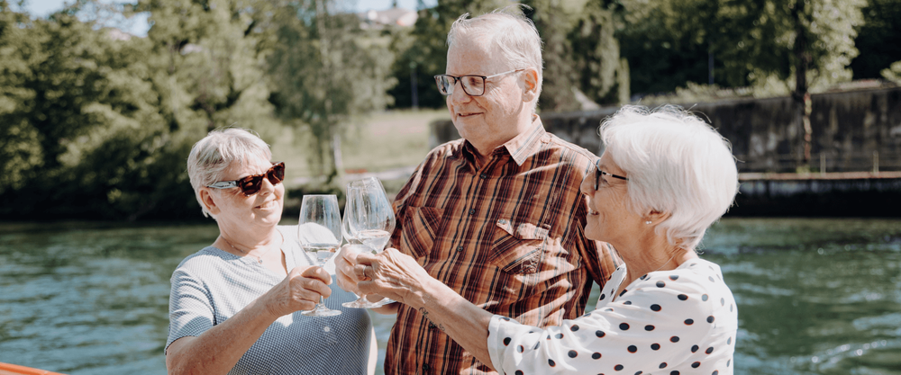 Auf der Fahrt von Schaffhausen nach Stein am Rhein können an Bord der URh köstliche Tropfen aus dem Schaffhauser Blauburgunderland degustiert und eine der schönsten Strom-Schifffahrten Europas erlebt werden.