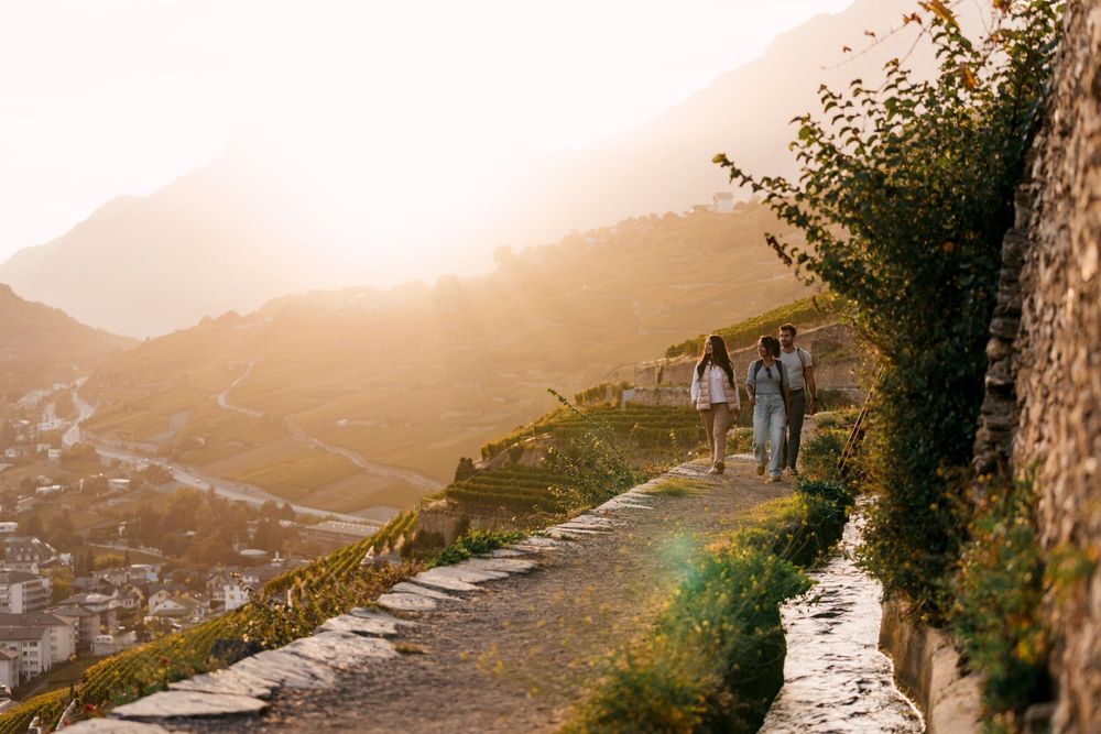 One beautiful example is the Bisse de Clavau between Sion and St.-Léonard. Once you have left the historic town centre of Sion behind you, a steady gurgling and splashing sound soon accompanies your every step. The water flows along the vines like a glistening ribbon.